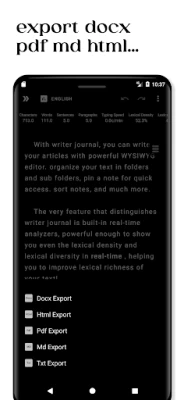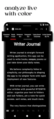 "writer journal" آپ کی تحریر کی گہرائی کو سمجھنے کے لیے متعدد حقیقی وقت کے تجزیہ کار پیش کرتا ہے۔ ان میں الفاظ، حروف، جملوں اور پیراگراف کی گنتی، منفرد الفاظ کی تعداد اور ان کی فیصد، لسانی تنوع، اور لسانی کثافت کا حساب شامل ہے۔ یہ آپ کو گرامر اور غیر گرامر الفاظ کی شناخت میں بھی مدد کرتا ہے، جس سے آپ کو اعلیٰ معیار کے مضامین اور مواد تیار کرنے میں مدد ملتی ہے۔ یہ ایک WYSIWYG مارک ڈاؤن ایڈیٹر ہے جو آپ کو روایتی ورڈ پروسیسرز کی الجھنوں کے بغیر اپنے کام کی منصوبہ بندی، تحریر اور اسے مزید تقویت دینے کی سہولت فراہم کرتا ہے۔ آپ آسانی سے عنوانات، بولڈ، اٹالک، انڈر لائن، سٹرائیک، بلٹس، کوٹس، ٹیکسٹ کے رنگ، امیجز اور سیپریٹر لائنز جیسے فارمیٹنگ آپشنز استعمال کر سکتے ہیں۔
